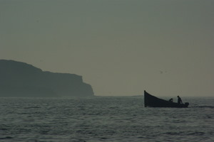 Eine abenteuerlich neue Welt: wir sind mitten im Fischereihafen! Mit Marina-Yachtleben hat das nichts mehr zu tun. Mitten im bunten Treiben der Fischer, die mit lautstarken Motormanövern an- und ablegen. Die großen Fischkutter liegen auf der gegenüberliegenden Seite des Hafenbeckens, vor Kopf ist das Hafenbecken gestopft voll mit offenen blauen Booten, die wie Nussschalen aussehen, auch wenn sie sicher vier/fünf Meter lang sind. Faszinierende Boote, eine wunderschön geschwungene Form mit einem riesigem, fast 3m hohen, geraden Steven, der die Fischer bei der Arbeit im offenen Boot stehend vor den atlantischen Wellen schützt. Wir fotografieren endlos, morgens vorm Frühstück bis abends vorm zu Bett gehen. Bei Sonne, Nebel und nächtlichem Flutlicht. Der Hafen hat seinen ganz eigenen Geruch und seine Geräusche. Fischköpfe und Innereien liegen herum, hunderte von Katzen und Möwen leben davon. Geduldig sitzen Katzen neben den Männern, die Fische ausnehmen und zuschneiden, sie können gelassen warten, bis das Mahl zubereitet ist, denn es ist ihnen gewiss und es gibt genug für alle. Im mittäglichen Nebel entfaltet diese Welt wieder einen ganz anderen Zauber, Männer ihre Karren schiebend, Fischer mit dem Fahrrad zur Arbeit fahrend oder über Netze gebeugt und sie reparierend am Boden sitzend. Es wimmelt von Menschen, neben den Arbeitenden kommen verhüllte Frauen, Männer in Kaftanen, oft in kleinen Gruppen, zu zweit oder dritt im Gespräch. Nachts, wenn wir durch den Hafen nach Hause gehen, genießen wir die Ruhe. Wieder ganz andere Stillleben. Die bunten Farben der zu Bündeln an Land zusammengestellten Fischerfähnchen leuchten im Scheinwerferlicht besonders intensiv