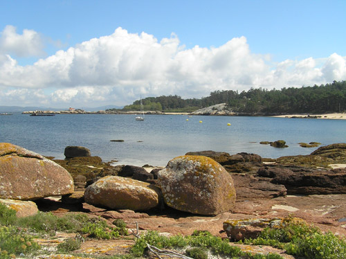 Die Isla Arosa mitten im Ria Arosa lockt uns mit seinen großen rundgewaschenen Felsen und wir legen zwei Ankertage auf der Insel ein. Schwimmen, Felsen fotografieren und Insel erkunden. Im ganzen Ria schwimmen hunderte von Muschelbänken (hölzerne Flöße von ca. 20x20m).