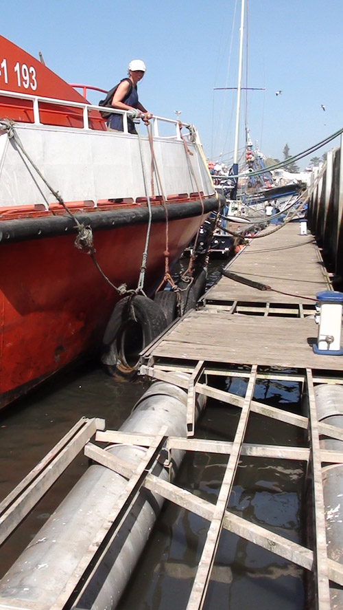 Eine abenteuerlich neue Welt: wir sind mitten im Fischereihafen! Mit Marina-Yachtleben hat das nichts mehr zu tun. Mitten im bunten Treiben der Fischer, die mit lautstarken Motormanövern an- und ablegen. Die großen Fischkutter liegen auf der gegenüberliegenden Seite des Hafenbeckens, vor Kopf ist das Hafenbecken gestopft voll mit offenen blauen Booten, die wie Nussschalen aussehen, auch wenn sie sicher vier/fünf Meter lang sind. Faszinierende Boote, eine wunderschön geschwungene Form mit einem riesigem, fast 3m hohen, geraden Steven, der die Fischer bei der Arbeit im offenen Boot stehend vor den atlantischen Wellen schützt. Wir fotografieren endlos, morgens vorm Frühstück bis abends vorm zu Bett gehen. Bei Sonne, Nebel und nächtlichem Flutlicht. Der Hafen hat seinen ganz eigenen Geruch und seine Geräusche. Fischköpfe und Innereien liegen herum, hunderte von Katzen und Möwen leben davon. Geduldig sitzen Katzen neben den Männern, die Fische ausnehmen und zuschneiden, sie können gelassen warten, bis das Mahl zubereitet ist, denn es ist ihnen gewiss und es gibt genug für alle. Im mittäglichen Nebel entfaltet diese Welt wieder einen ganz anderen Zauber, Männer ihre Karren schiebend, Fischer mit dem Fahrrad zur Arbeit fahrend oder über Netze gebeugt und sie reparierend am Boden sitzend. Es wimmelt von Menschen, neben den Arbeitenden kommen verhüllte Frauen, Männer in Kaftanen, oft in kleinen Gruppen, zu zweit oder dritt im Gespräch. Nachts, wenn wir durch den Hafen nach Hause gehen, genießen wir die Ruhe. Wieder ganz andere Stillleben. Die bunten Farben der zu Bündeln an Land zusammengestellten Fischerfähnchen leuchten im Scheinwerferlicht besonders intensiv