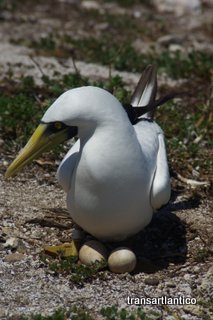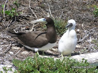 Mit zwei Damen vom Nationalpark haben wir schnell eine Besichtigung der Insel Siriba für den nächsten Morgen vereinbart. Um 10 Uhr gehts los, jeder mit seinem Schlauchboot. Wir landen auf dem kargen Eiland mit genau 9 Palmen und bekommen einen Vortrag über die Inselbewohner: hunderte von Basstölpel und einige Fregattvögel, die wohnen aber eigentlich auf der Nachbarinsel.
