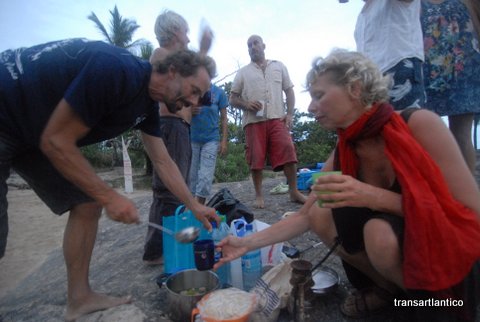 Nach eiligen Vorbereitungen, Pastasalat, Guacamole, Vanillepudding und einem großen Kochtopf voll Caipirinha, treffen wir uns vor Sonnenuntergang mit den anderen Crews zur Strandparty. Alle bringen noch etwas Leckeres mit und es wird ein wunderbarer Abend.