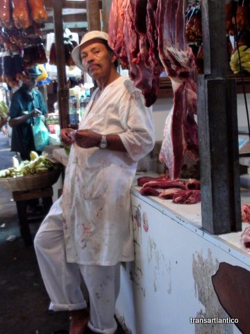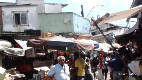 Wir wollen auf den großen Markt von Sao Joaquin, ein alternativer Tipp aus dem Reiseführer. Außerdem brauchen wir Obst und Gemüse. Wir fragen eine ältere Frau an der Haltestelle nach dem richtigen Bus ja, hier, sie fährt auch dorthin. Beim Aussteigen in einem etwas heruntergekommenen Hafenviertel zeigt sie auf ein paar Marktstände an der Straße, wir schauen uns fragend an, gehen langsam, zweifelnd rüber und tatsächlich, wie ein orientalischer Bazar zieht sich der Markt durch viele Gassen der favelaartigen Bebauung.