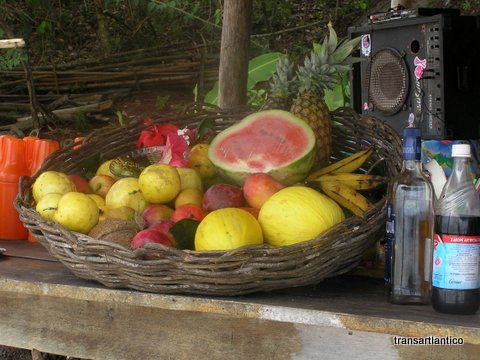 Wir kaufen reichlich Obst und Gemüse (Mango, Ananas, Bananen, Kaki, Limonen, Apfelsinen und Möhren, Chu Chu) und Würste beim Metzger.